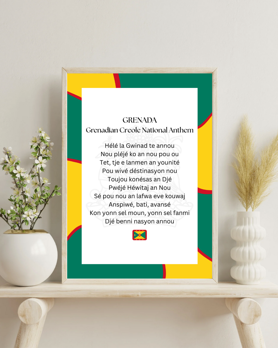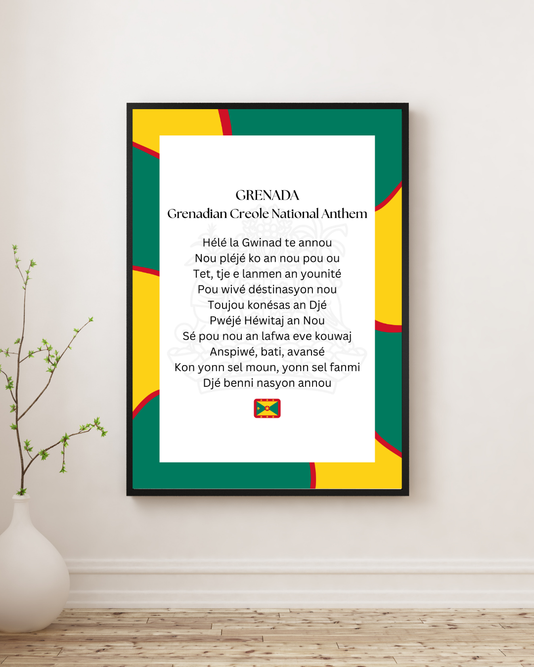 Bring the spirit of Grenada into your home with this beautifully designed Grenada National Anthem Poster Print in Grenadian Creole. Featuring the anthem written in the island’s native language and framed by a bold swirly border in the colors of the Grenadian flag, this piece is more than just wall art — it’s a true celebration of Grenadian pride, culture, and heritage.