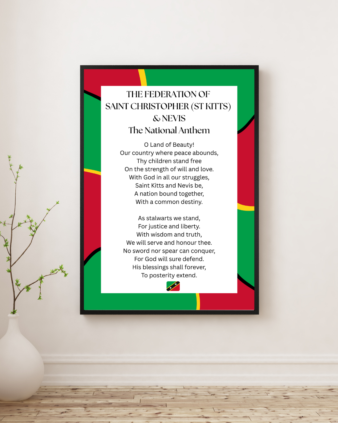 Bring the spirit of Saint Kitts and Nevis into your space with this beautifully designed poster print featuring the national anthem. Framed by an elegant swirly border in the bold, vibrant colours of the Kittitian flag, this piece is more than just décor, it’s a tribute to pride, heritage, and identity.