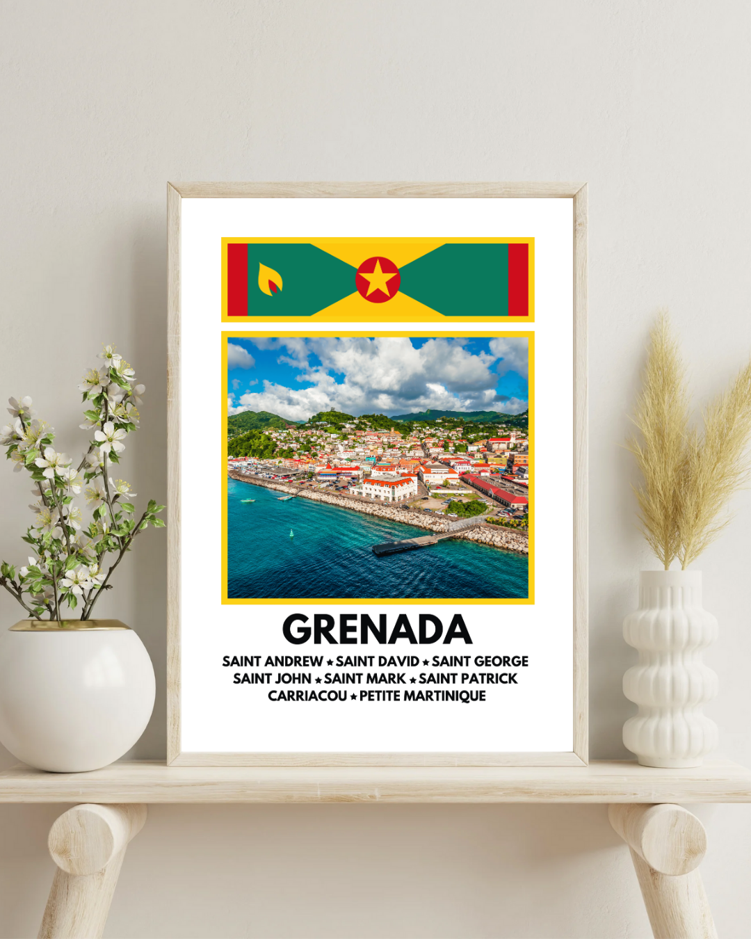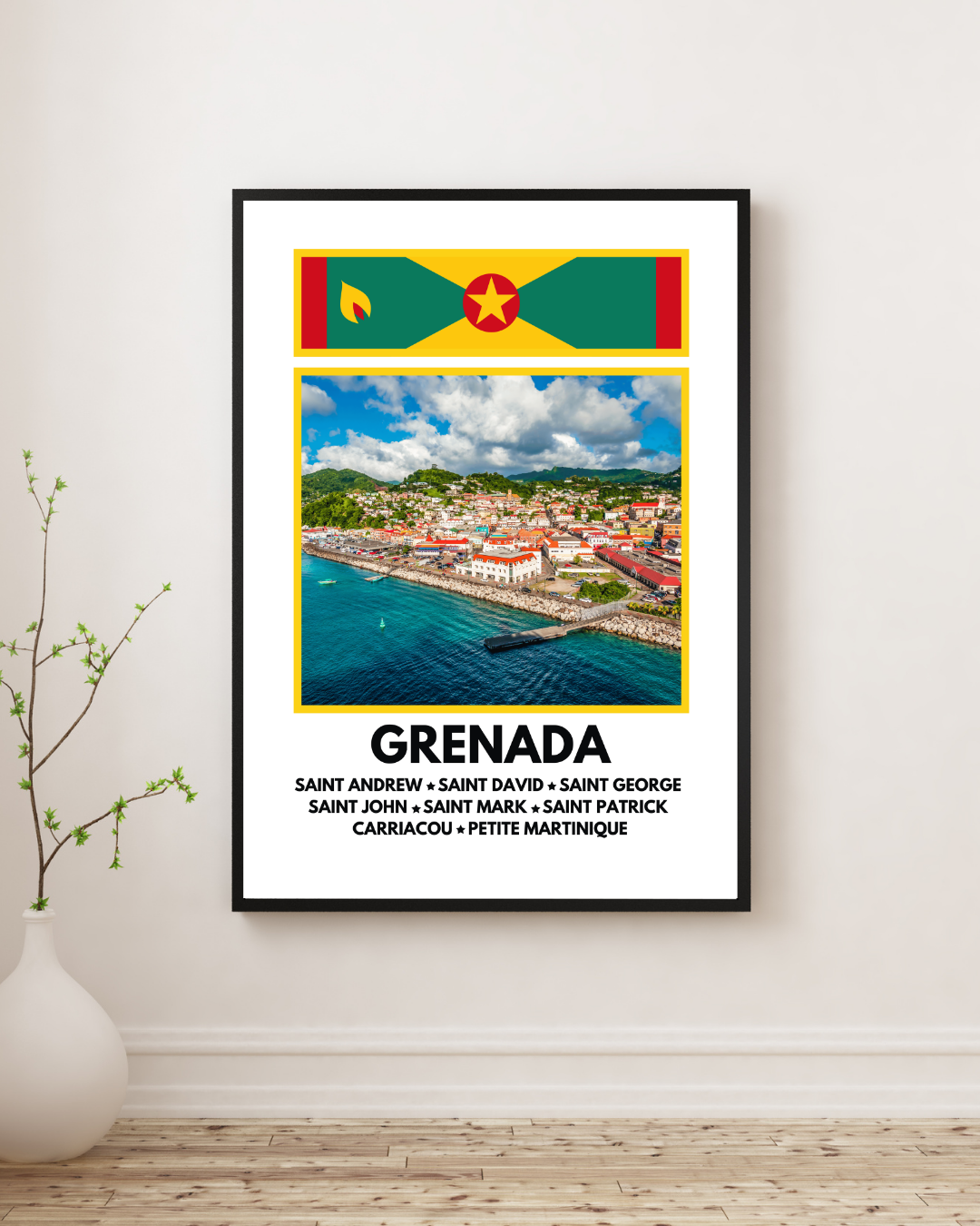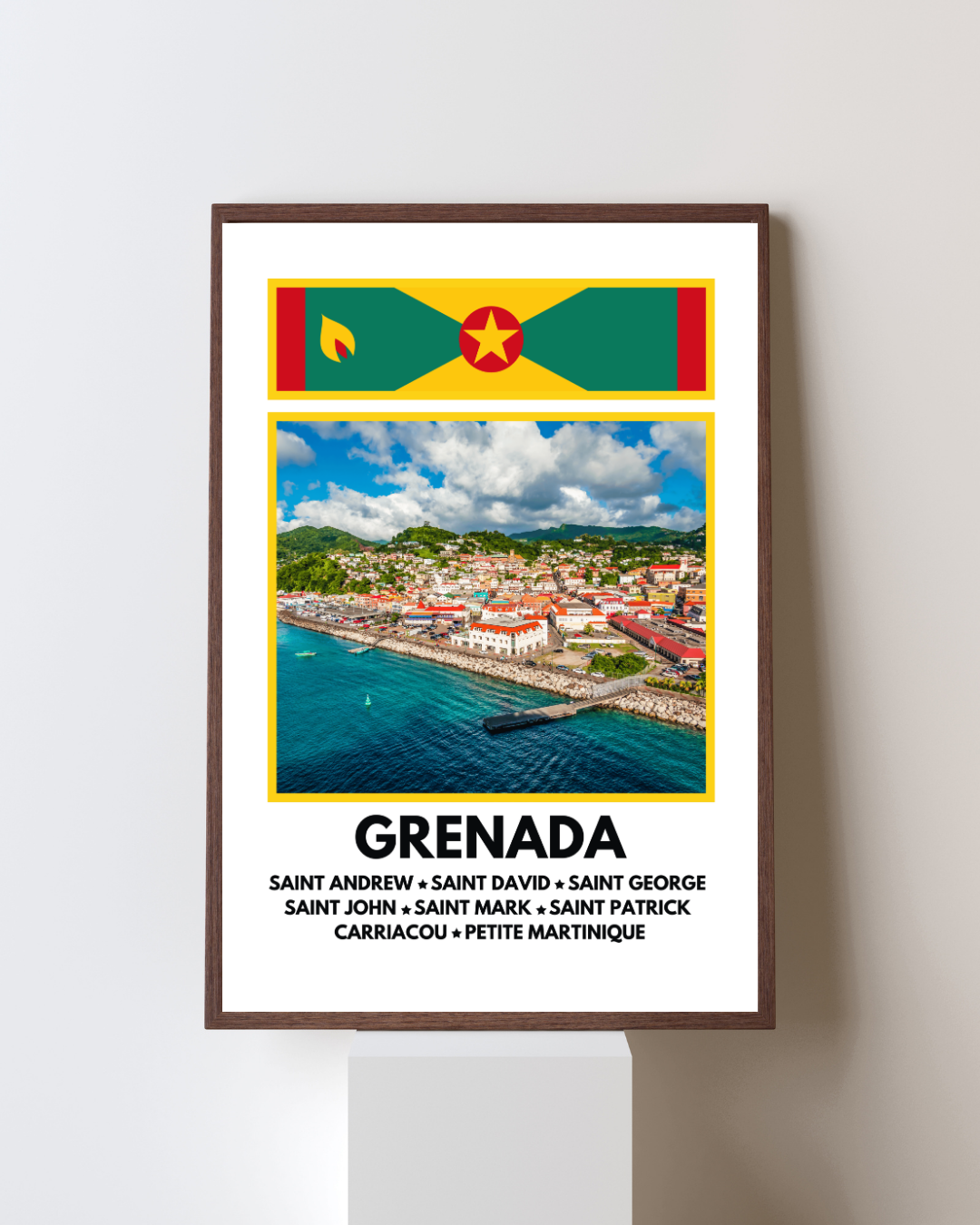 Featuring a vibrant image of St George’s, the capital of Grenada, paired with the island’s national flag at the top and a full list of Grenada’s parishes below, this artwork is a true celebration of Grenadian pride and heritage.