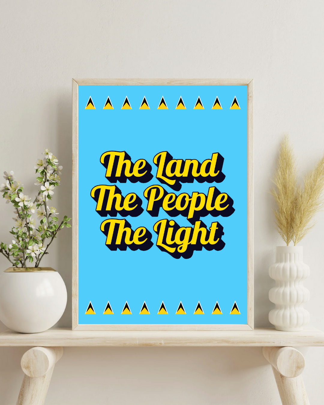 Showcase your pride in Saint Lucia with this bold and elegant poster featuring the island’s motto: “The Land, The People, The Light.” This inspiring motto speaks to the beauty of Saint Lucia’s lush landscapes, the strength and vibrancy of its people, and the enduring hope and illumination they bring to the world.