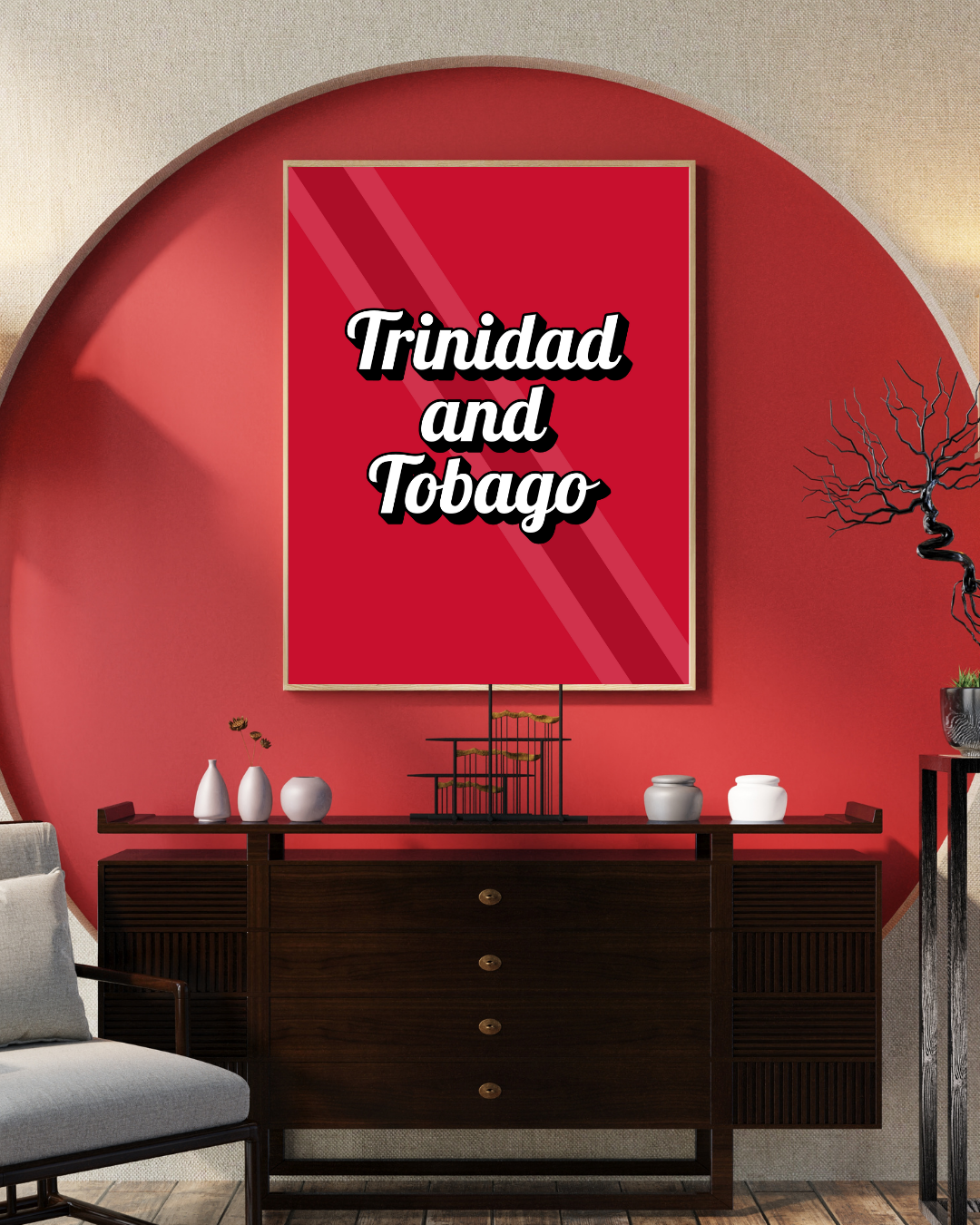 Bring the vibrant energy of Trinidad & Tobago into your space with this striking poster. Featuring the words Trinidad & Tobago in bold white pop text against a red background with a subtly faded flag, this design captures the essence of the islands’ rich culture and heritage.